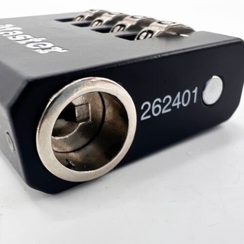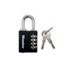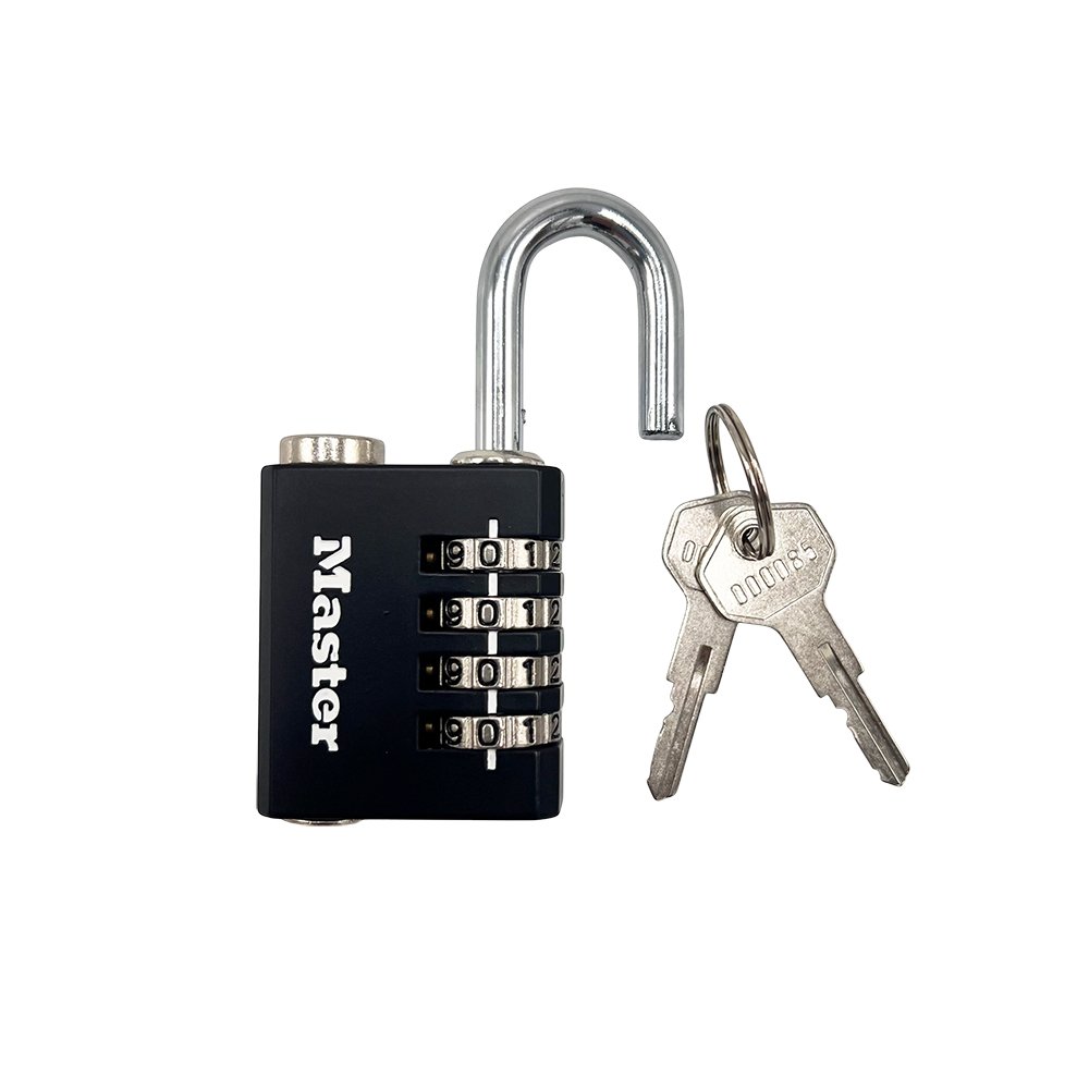 The Master Lock No. 7641EURDBLK Set-Your-Own Combination Padlock with override key features a 40mm wide solid zinc body for durability with a black painted finish. The 6mm diameter shackle is 27mm long and made of nickel-plated steel, offering resistance to cutting and sawing.