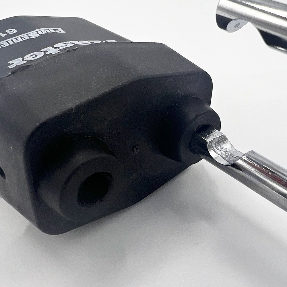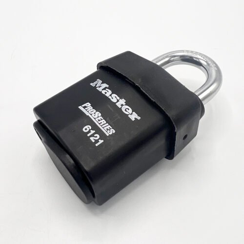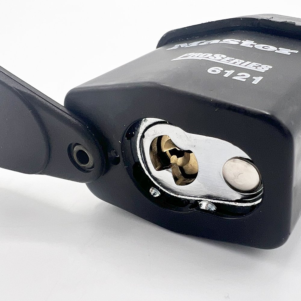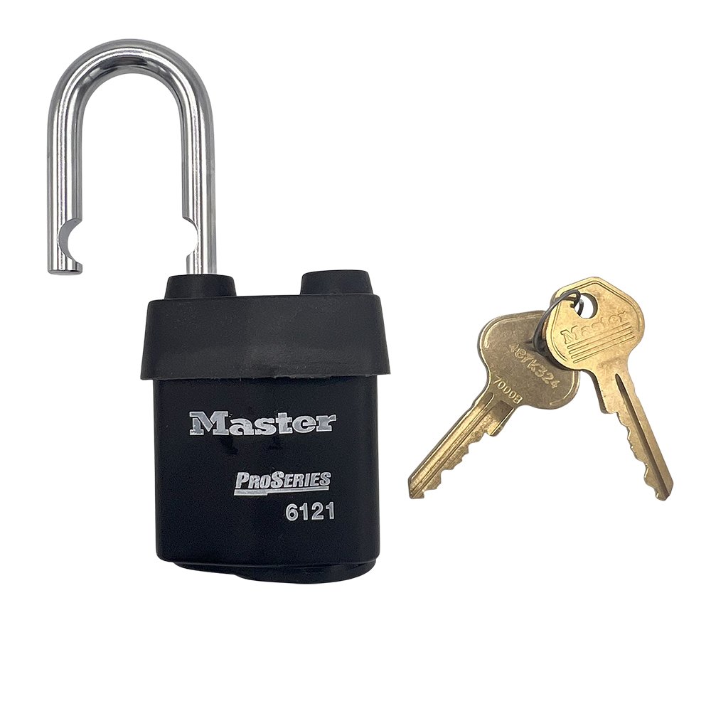 The Master Lock No. 6121 ProSeries® Weather Tough® Covered Laminated Padlock features a 2-1/8in (54mm) wide heavy steel body to withstand physical attack and a 1-1/8in (29mm) tall, 5/16in (8mm) diameter hardened boron alloy shackle for superior cut resistance. The exclusive cover protects this padlock from harsh elements & a high security, rekeyable 5-pin cylinder with spool pins is virtually impossible to pick.