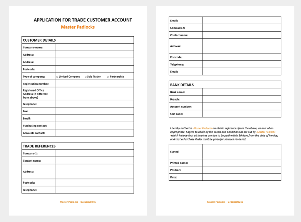 At Master Padlocks, we value strong and trustworthy relationships with our trade customers. To offer you the convenience of credit terms, we require some essential details to assess your creditworthiness.